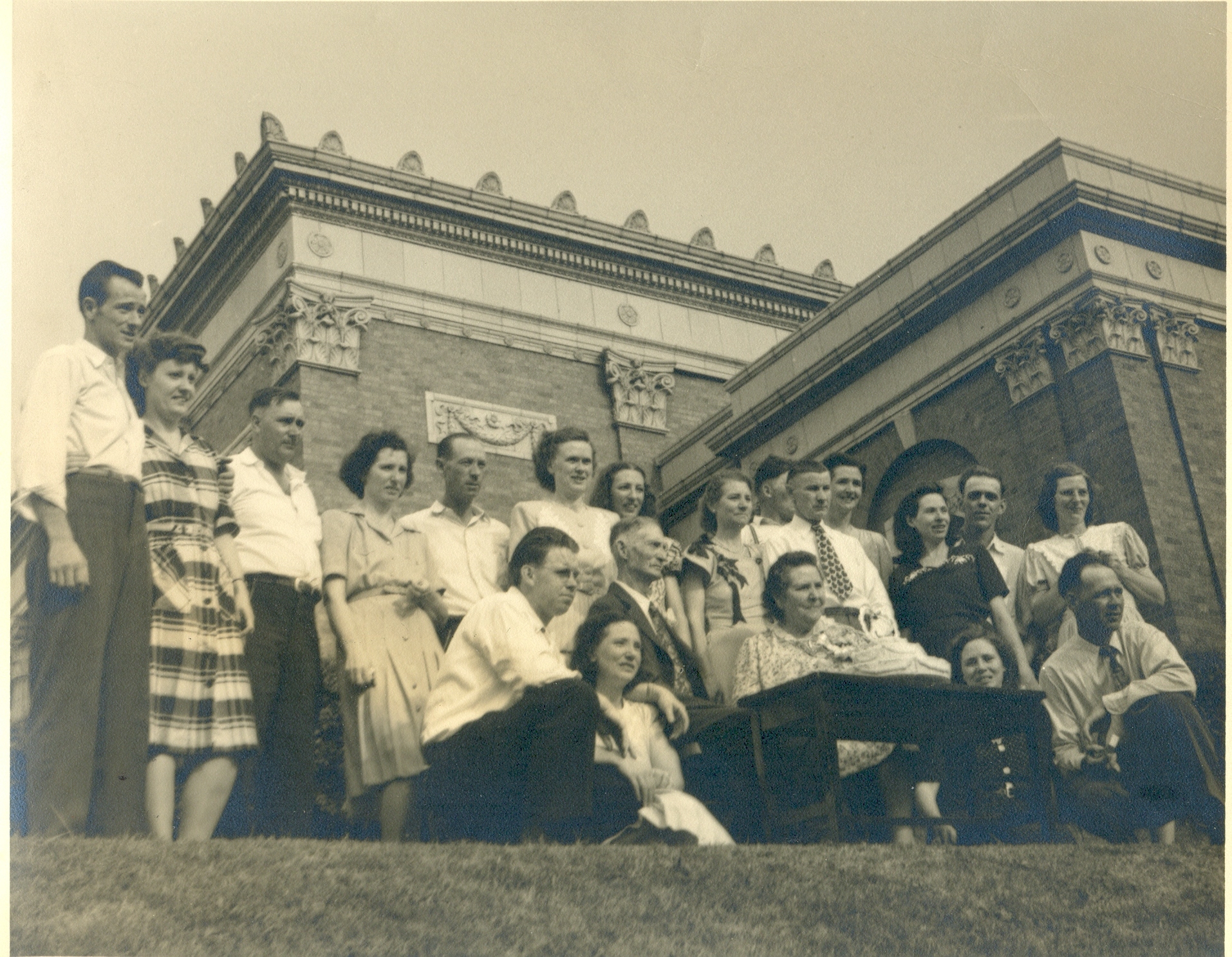 Ed and Mary Baggett celebrated their 50th Wedding Anniversary in Waupun, WI in 1957. This photograph of them, their children and their spouses was taken in front of the City Hall in Waupun. Missing in the picture were Agnes husband Vick who was working, and Dorothys husband Eldridge who had been there but had to go back to work. Pictured from Left to Right: Hank and Helen Baggett, Ray and Lola Van Loo, Harley and Murial Baggett, Dorothy Leberak, Harlan and Edith Baggett, Ed and Mary Baggett, Elsa Smitty, Otto, Agnes, Billie and Bernie Vis, Neva Smith, Cleo and Fritz Brinkman