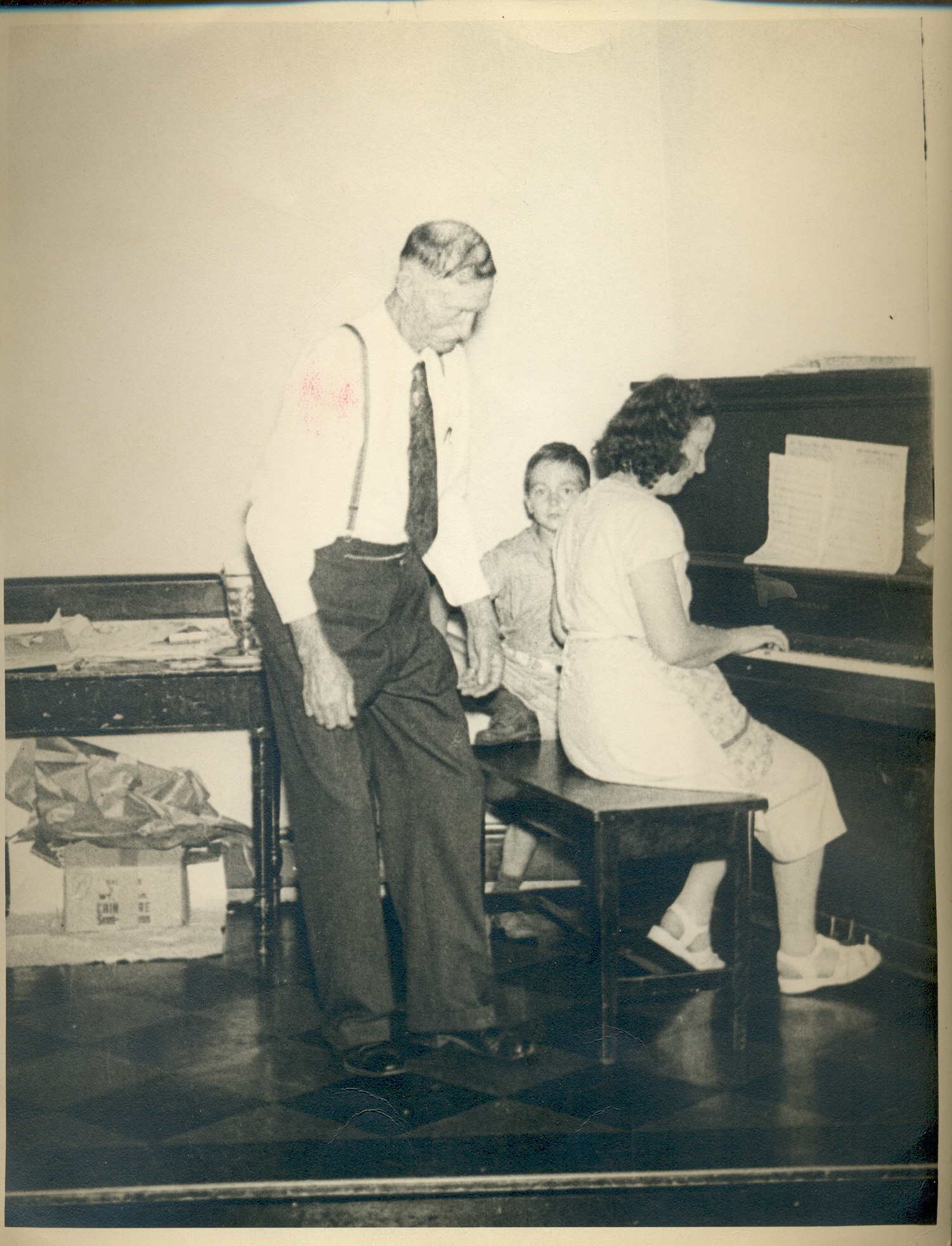 Edward Baggett dancing a jig, while Edith plays the piano and I watch from behind the piano. The photo was taken at their 50th Anniversary in 1947
